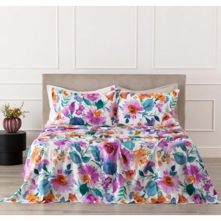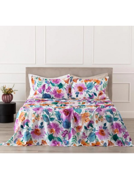 Il completo lenzuolo copriletto matrimoniale Melika porta in camera un’eleganza floreale contemporanea grazie alla stampa digitale su percalle 100% cotone, che restituisce colori intensi e dettagli nitidi. Il motivo botanico, raffinato ma attuale, dialoga con il sotto lenzuolo e il retro delle federe in tinta unita, creando un equilibrio visivo pensato per ambienti curati e luminosi. La texture del percalle è fresca, liscia e compatta, ideale per chi cerca qualità tessile e comfort quotidiano.