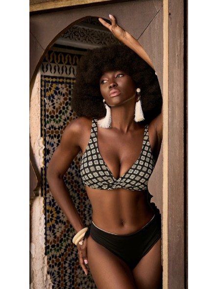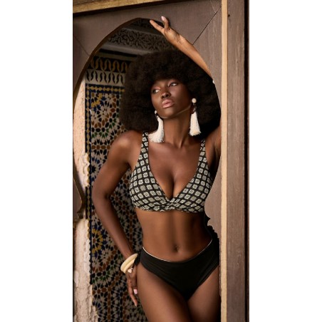 Giadamarina bikini Elite della linea iconic look, disegno etnico dai colori neutri e disegno etnico con effetto scintillante, spalline regolabili coppa avvolgente senza ferretto per uno stile comodo ma sofisticato, il tutto coordinato con uno slip alto in tinta unita nero double con coulisse per regolare a piacere la sgambatura dello stesso. Eleganza e stile donano una presenza scenica importante.